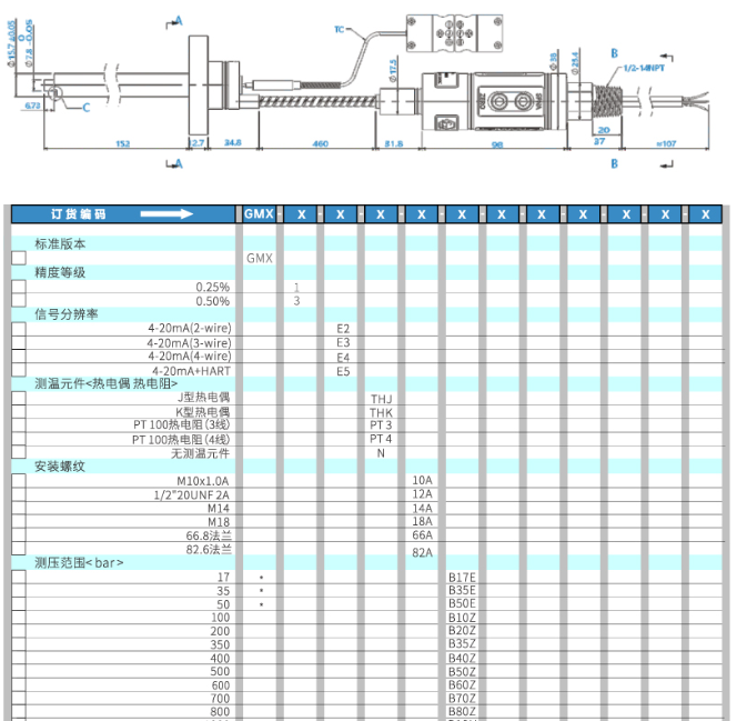 fid廣州南創電子科技有限公司Graeff 綠色填充DTA系列的高溫熔體壓力傳感器的特點是使用壽命長、的材料、的測量性能和食品級的傳輸介質。我們的傳感器完全由不銹鋼制成,一種特殊材質的膜片,并使用鈦及其他金屬合成的涂層保護膜片不受黏度和摩擦性較大物質的影響。傳感器使用的其他材料通過高強度的測試并由特殊工藝制造。不像NaK或汞填充的介質,環保合金介質填充受溫度漂移的影響更小更穩定。因為使用了對環境無害的材料,所以我們的傳感器可以用于食品和制藥。所有熔體壓力傳感器不同的剛性桿長度和柔性管長度都可以根據現場工作環境在選型表中對應選擇。DTA版本已經包括了一個可更換的溫度傳感器,可選擇電偶或熱電阻作為測溫度元件。