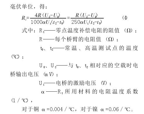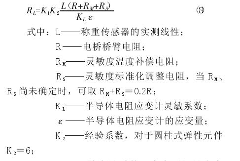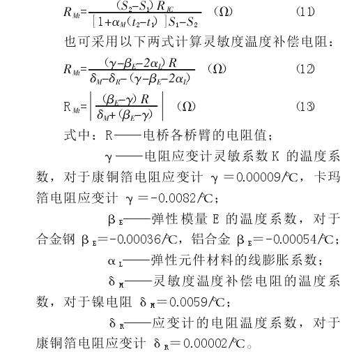 實踐證明,對于普通準確度級別的稱重傳感器,只要彈性元件結構、尺寸、材料、電阻應變計、制造工藝完全一樣,可以采用由抽樣方法經過試驗取得靈敏度溫度補償電阻最佳值進行補償,而不必逐一反復測試調整。對于高準確度稱重傳感器和在工作溫度變化大 (例如-15℃~50℃)的環境下工作的稱重傳感器,為了得到較高的補償精度,使其在工作溫度范圍內具有較小的靈敏度溫度誤差,必須逐個進行測試調整。此時焊入稱重傳感供橋電路的靈敏度溫度補償電阻 RMt應比理論計算值大 10%~15%,為過補償。然后在其上并聯一個高精度、低溫度系數的金屬膜電阻 RP,來改善 RMt的非線性,通常稱為靈敏度溫度補償的線性化調整電阻。進行補償時,可用精密電阻箱代替線性化調整電阻便于精密調整,待求得最佳調整電阻值時再用金屬膜電阻替換。必須強調指出,補償測試溫度點至少應選取三點,即最高工作溫度、最低工作溫度和常溫,而不易只選取常溫和最高工作溫度兩個點,這是因為靈敏度溫度補償鎳電阻與溫度不成線性關系。