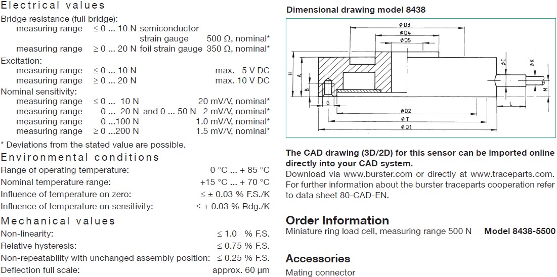 德國Burster 8438-5100微型環式稱重傳感器訂購信息: