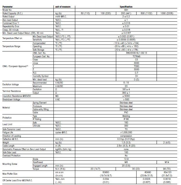 SSH系列稱重傳感器其他相關型號及量程具體詳細信息: