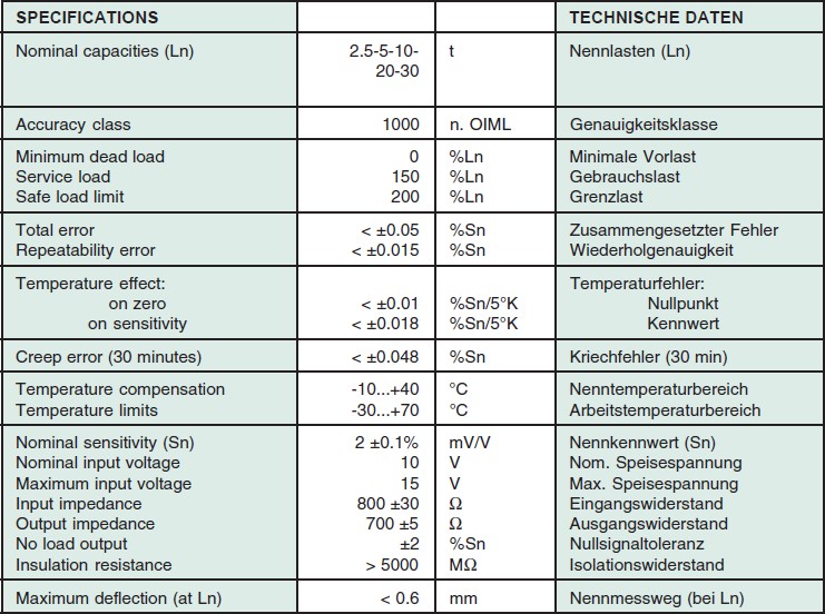 精度等級為1000N 。 OIML Genauigkeitsklasse零< ± 0.01 %的Sn / 5 °K Nullpunkt