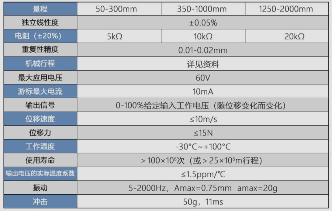 yar廣州南創電子科技有限公司杰佛倫圓柱型位移傳感器PC-M-0400 PC-M-0450相關特點: yar廣州南創電子科技有限公司PC直線位移傳感器(別名:電子尺,電阻尺,電位器,位移傳感器)原理:電位計原理,使用 2 個球節的機械固定和自對準連桿,最大角運動達 ± 30°,獨立線性度 ± 0.05%,可重復性 0.01 毫米,無限分辨率。超出理論電氣行程后無電氣信號輸出變化安裝更簡單。輸出直流電壓信號,也可以通過內置或者外置的變送模塊講信號轉換成標準的0-5V、0-10V或者4-20mA直流信號,也可以遠距離傳輸控制要求。適用于各種高機械強度場合的位移測量。