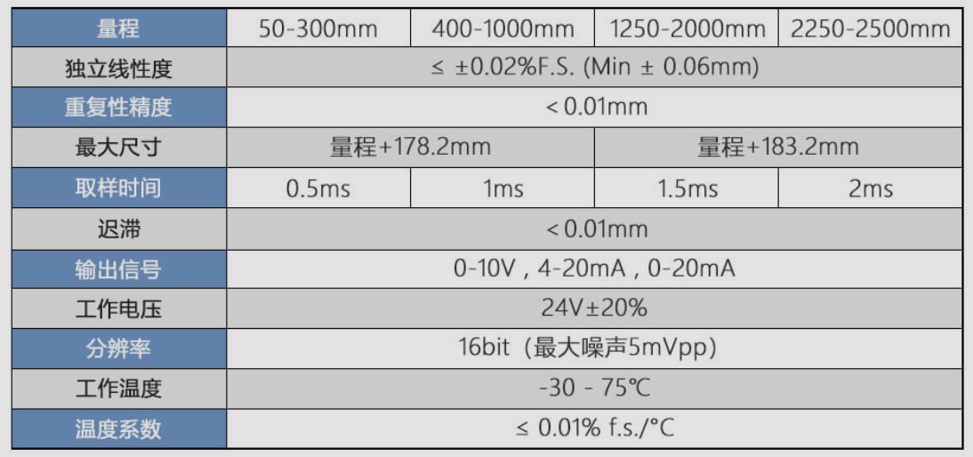 gyo廣州南創電子科技有限公司杰佛倫直線位移傳感器WRP-A-B-175-E-1 WRP-A-B-300-E-1相關特點: gyo廣州南創電子科技有限公司WRP-A系列磁致伸縮位移傳感器采用了HYPERWAVE磁致伸縮技術。模擬接口可提供各種電壓或電流輸出范圍,確保安裝更簡便,更容易適應現有系統。游標上沒有電氣接觸,避免了磨損,延長了使用壽命。參考了非線性、可重復性和滯后的高精度測量。高抗振動、抗機械沖擊,適用于惡劣的工業環境。