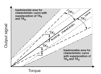 對于1kNm的扭矩(額定扭矩),這相當于1N⋅m。但是,對于200Nm的扭矩,偏差僅為0.2N⋅m,因為TKC始終是指實際輸出信號的百分比偏差,這是因為靈敏度基于的是直線斜率。在43°C(與額定溫度相差20K)下使用相同的傳感器,在最壞的情況下,可能導致最大偏差高達0.2%。并且不適用于在3°C下使用,因為該溫度不在額定溫度范圍內。
