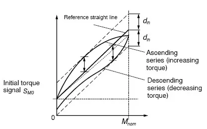 為了確定線性誤差,負載需要從零增加到額定扭矩并進行了一系列測量。基準直線是穿過初始點的最佳擬合直線。規定的線性偏差是實際輸出信號與參考直線的最大偏差。也可以描述為公差帶(偏離直線的上下偏差量之和)寬度的一半,該寬度與基準直線對稱。