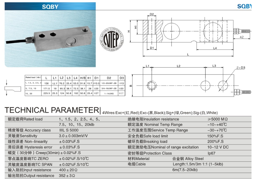 Qcf廣州南創電子科技有限公司Qcf廣州南創電子科技有限公司寧波柯力稱重傳感器SQBY-1klb產品技術參數及尺寸圖:Qcf廣州南創電子科技有限公司