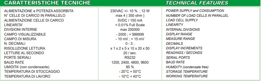Indicatore di peso in acciaio inox AISI 304 IP67, idoneo per l’installazione da tavolo o fi ssaggio a parete o a colonna. Dimensioni: 210 x 140 x 75 mm (245 x 140 x 260 mm max ingombro con staffa di supporto). Display semialfanumerico a LED rossi, 6 digit da 20 mm, 7 segmenti. Tastiera impermeabile con 5 tasti funzione. Batteria interna ricaricabile 6V 4Ah con cavo di rete 230Vca. Connessioni stagne IP67.