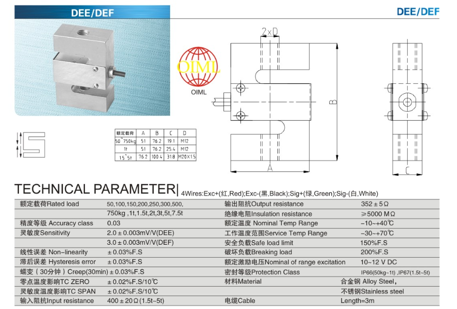 fnG廣州南創電子科技有限公司 fnG廣州南創電子科技有限公司寧波柯力稱重傳感器DEE-750kg產品技術參數及尺寸圖:fnG廣州南創電子科技有限公司