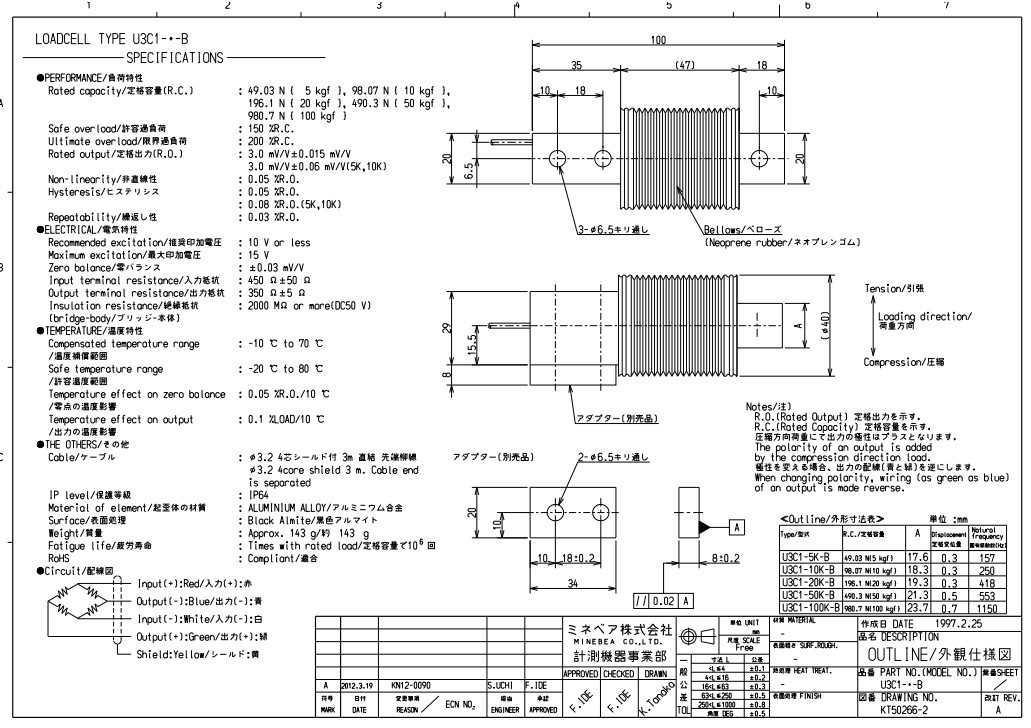 額定輸出 | 3毫伏/ V±0.015 mV /視頻(U3C1-5K~10K-B:3 mV / V的±0.06毫伏/ V) |