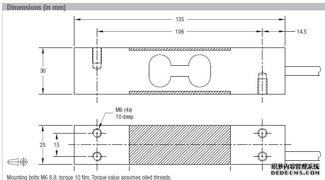 測力傳感器上設置有一個屏蔽,6芯電纜(AWG26)。