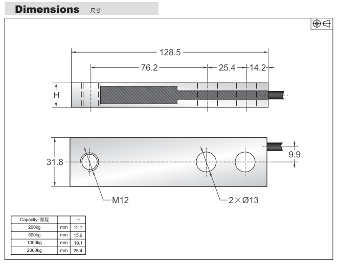 C7g廣州南創(chuàng)電子科技有限公司美國傳力SBST-200kg稱重傳感器產(chǎn)品尺寸圖:C7g廣州南創(chuàng)電子科技有限公司