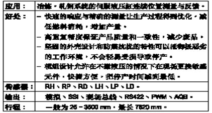 傳感器的外殼類型、磁鐵類別、接頭方式、電纜長度、安裝方式等均由用戶或設計院決定,而輸出模式則應根據用戶選用的控制器而定,這些選項不是MTS公司能決定的,但可以提供協助。 應用范圍: MTS產品應用十分廣泛,特別概括了一些成功應用領域 測量范圍-動作感應,直線性位移,弧度線性位移,速度 測量目的-位置測量,回授控制(閉環系統) 測量數據-絕對位置,速度,相對位置 應用環境-所有需要高速,精確,長,短行程的作動系統,如液壓動力,伺服位置與速度控制 目標市場-工業:工廠自動化生產線,如鋼鐵廠,注塑與壓鑄,木材加工,水電廠和紙品加工 商業:汽車,行走機械,飛機,消費電子,醫療設備,家用電氣等 專業:特殊案子,如斜坡護土監控及打撈俄羅斯庫爾斯克號潛艇 |